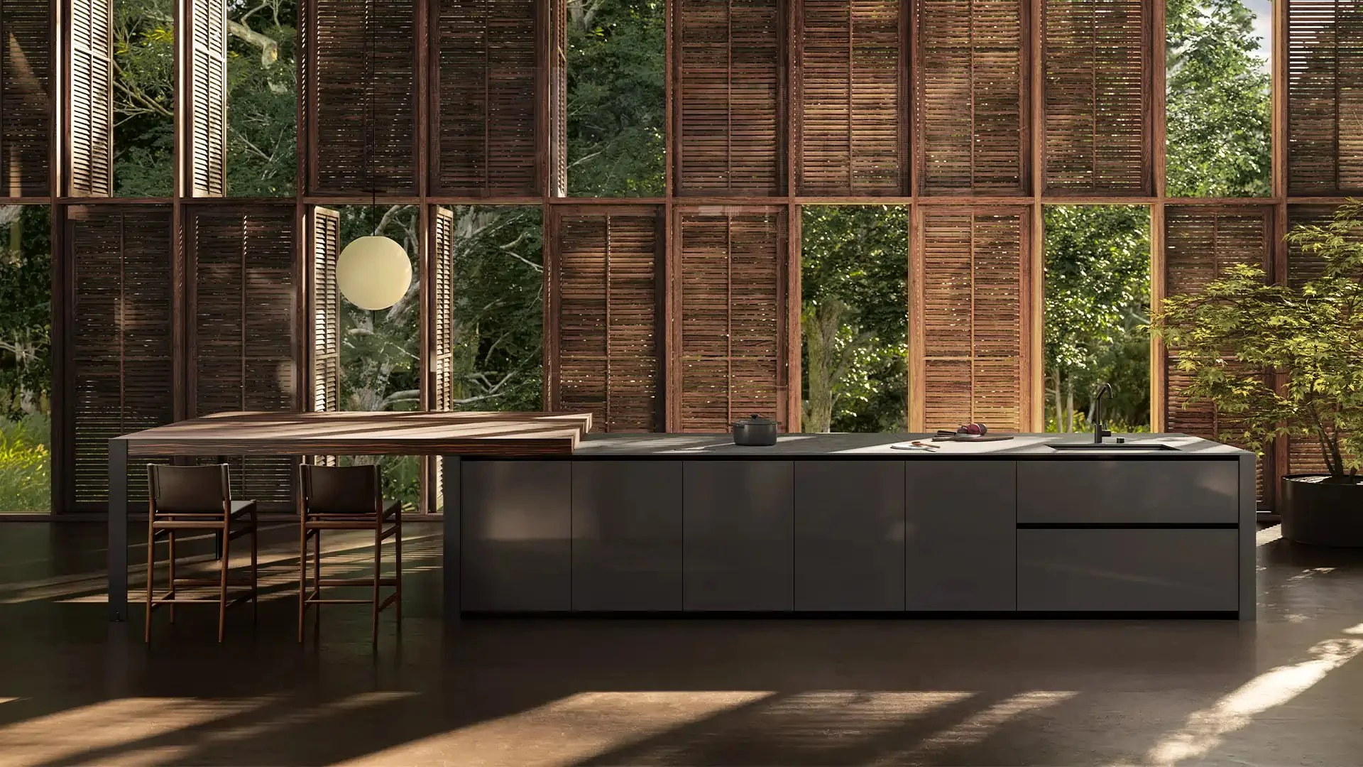 Novi kuhinjski sistemi z materiali, ki se prvikrat postavijo v bivalne prostore, se zaradi obsežnosti programa fluidno vključijo v prostor in vodijo oblikovalsko nit celotnega interierja.